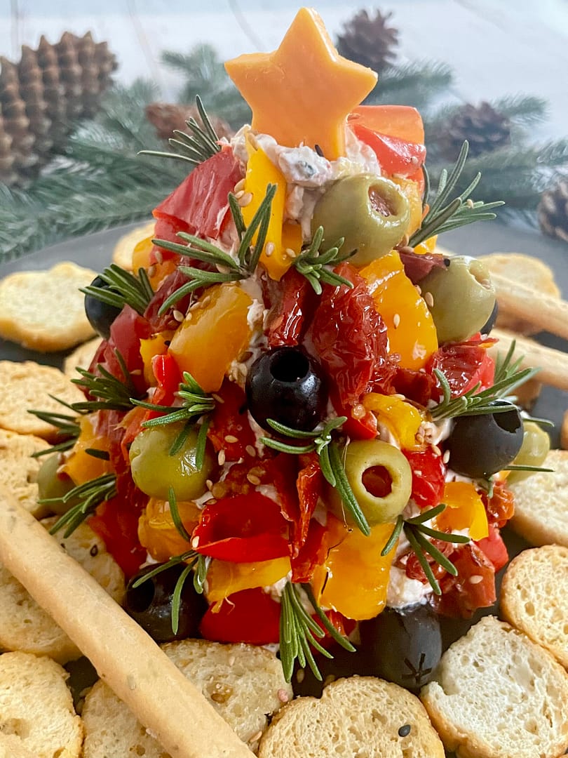 - Ensuite déposer le sapin dans un plat de présentation et recouvrir de garniture, olives, tomates séchées, poivrons marinés et petites branches de thym.